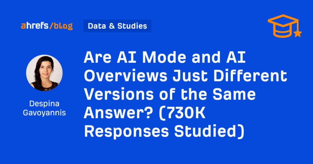 We analyzed September 2025 US data from Ahrefs’ Brand Radar, examining 540,000 query pairs for citation and URL analysis, and 730,000 query pairs for content similarity analysis. For each query, we captured both an AI Mode response and an AI Overview response.